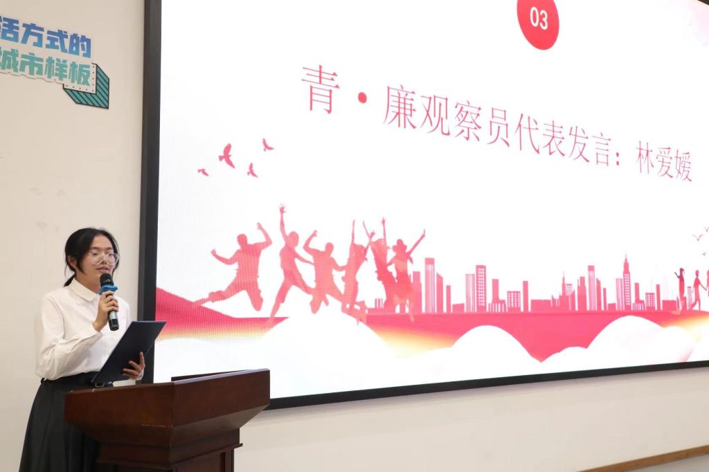 本科生第三党支部的林爱嫒同学作为“青·廉观察员”代表发言,她表示很荣幸能成为“青·廉观察员”里的一员,之后将会积极配合小镇做好监督检查工作,为维护小镇清廉文明的健康生态圈,提出自己的意见建议,为清廉菠菜、青·廉小镇建设贡献自己的智慧与力量。