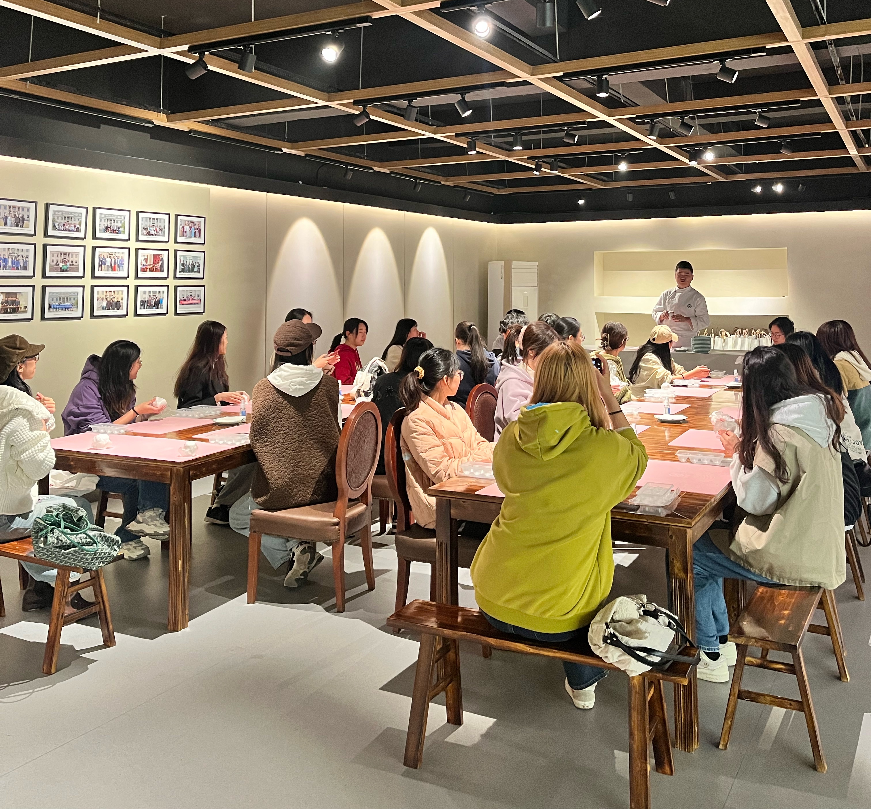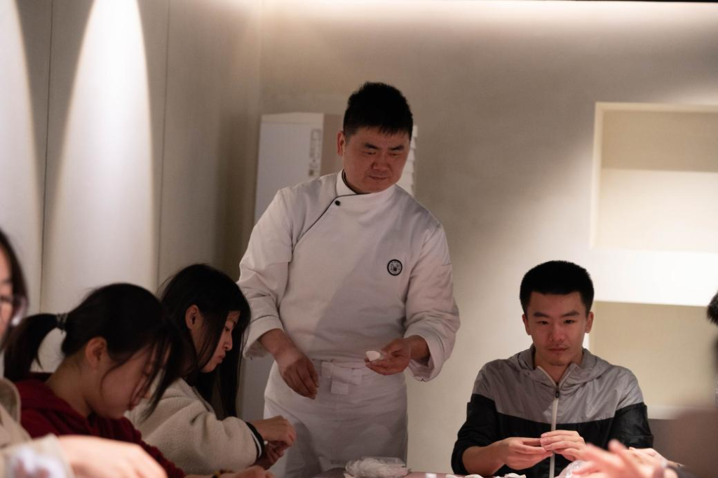 走出车间后,在专业面点师的指导下,每位同学还亲自体验了汤圆制作。首先将准备好的面团反复翻叠,使其富有韧性,再将面团搓成圆柱状,把圆柱均匀地分成一块块相同大小的剂子,用大拇指按压面团中心,使其有足够的空间能容纳黑芝麻馅料球,后左右手搭配,用手指和虎口慢慢收口、塑形。同学们还现场品尝了缸鸭狗芝麻馅、榴莲馅的汤圆,感受汤圆的美味。