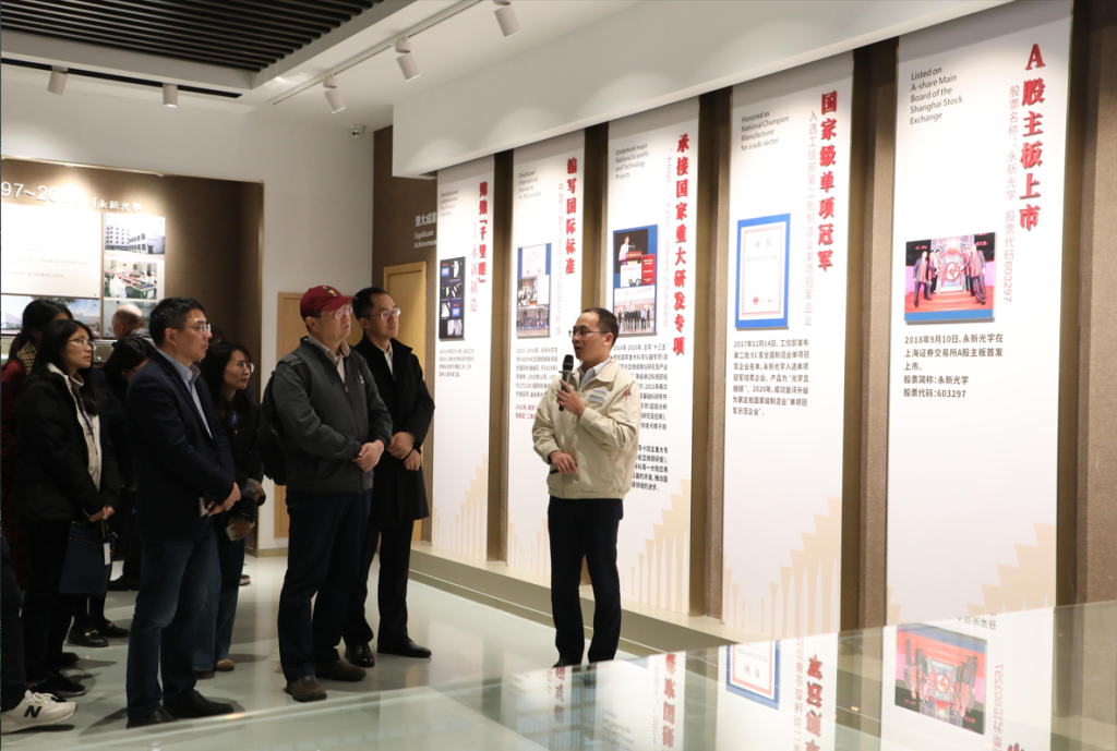 随后,众人到访第二家企业——永新光学。现场工作人员对企业产品、创始人和发展历程做了系统介绍,提到企业的阶梯式学习模式,对公司取得的重大成果,诸如“嫦娥千里眼” “中国人首次主导显微镜国际标准”“承接国家重大研发专项”等一一进行了介绍。众人通过宣传片、产品展间和无尘生产车间的参观,对永新的科技理念、产品标准和管理能力有了更直观的感受。