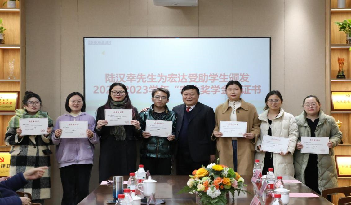 会议开始,主持人介绍出席仪式的领导和嘉宾,通过短片回顾了陆董、贺董和赞助学生的点点滴滴,并介绍宁波大学“宏达奖助学金”“恒达奖助学金”项目概况。由学生发展与服务处副处长朱燕宣读2022-2023学年“宏达奖学金”“恒达奖学金”获奖名单,陆汉幸先生、贺行平先生为在场获奖学生颁发“宏达奖学金”“恒达奖学金”证书。