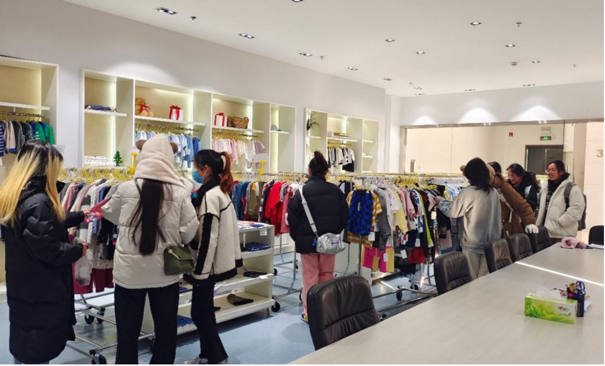 活动现场,方经理和周经理热情地接待了师生们,并带领师生们参观了百纳服装有限公司的童装及成人装样品间,琳琅满目的服装让师生们应接不暇。随后方经理带师生们参观了产品车间,观摩了服装的打版、剪裁、熨烫等环节,让同学们对服装生产的流程有了更深入的了解。