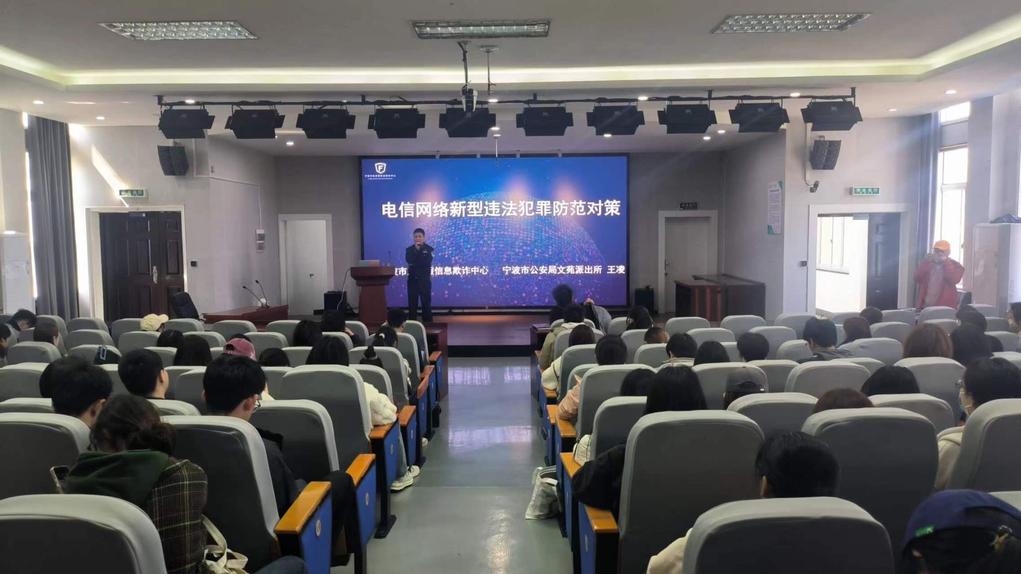140余位学生做题为“关于电信网络新型违法犯罪防范对策”的主题教育。讲座由学工办主任陈彬主持。