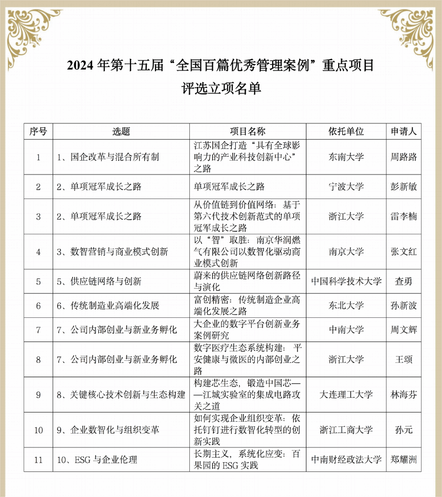 彭新敏教授主持的《单项冠军成长之路》项目申请通过评审,获重点项目立项,这是彭新敏教授团队继在第十届和第十三届评选中取得佳绩后,再次获批立项。