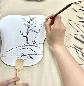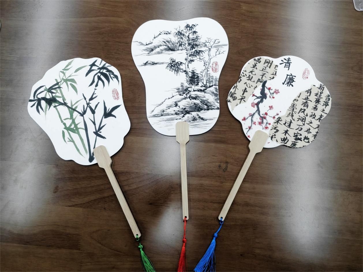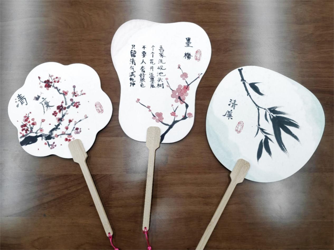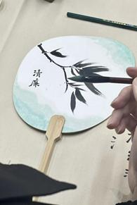 随后,学生党员们观看了绘制扇面的教学视频,视频中团扇的设计采用传统的水墨与书法相结合方式,在制扇工人的巧手下,一把把团扇犹如展出的工艺品让人眼前一亮。章舒怡执笔率先在扇骨上做起了示范,梅兰竹菊等传统清廉元素图案在纸上铺陈开来。