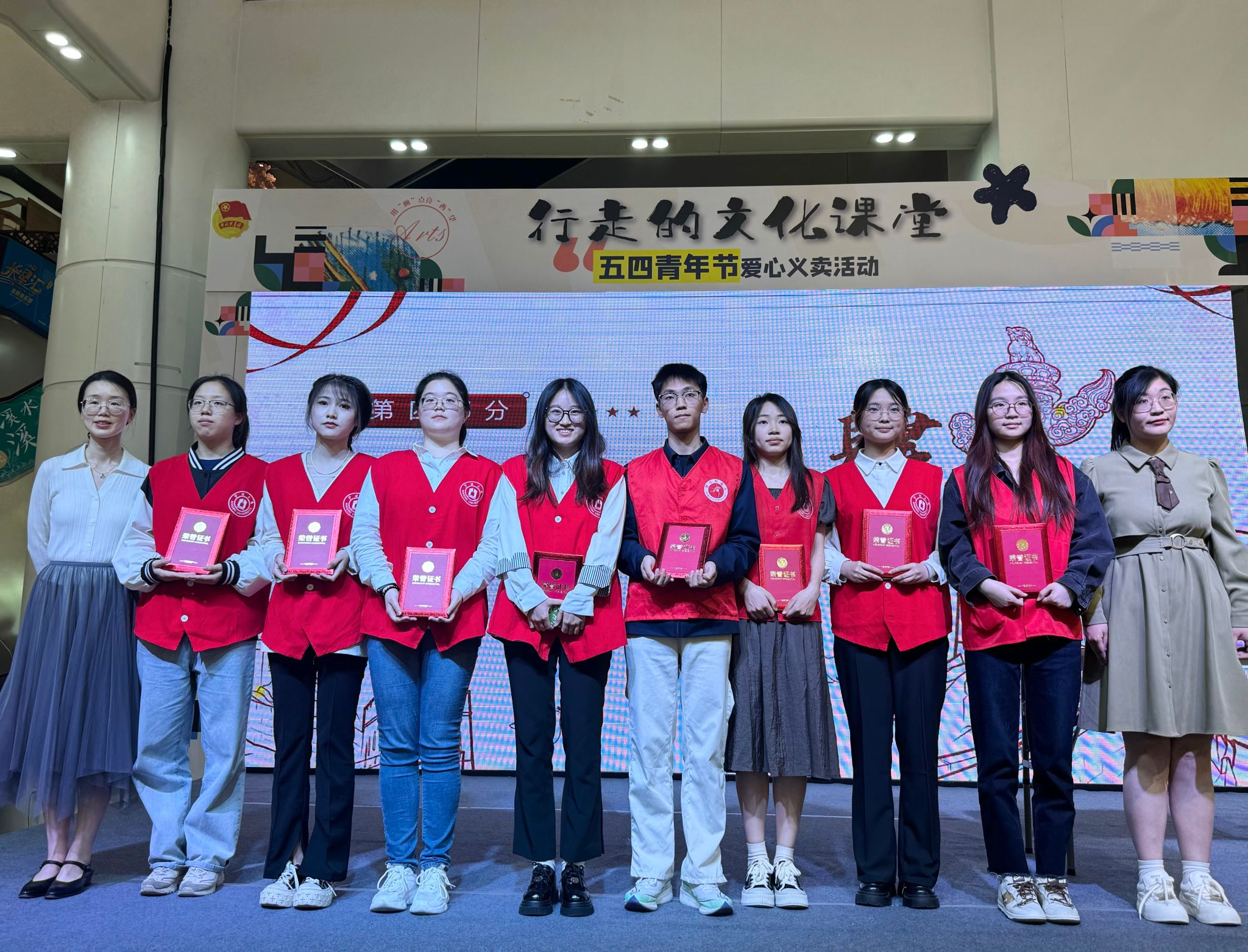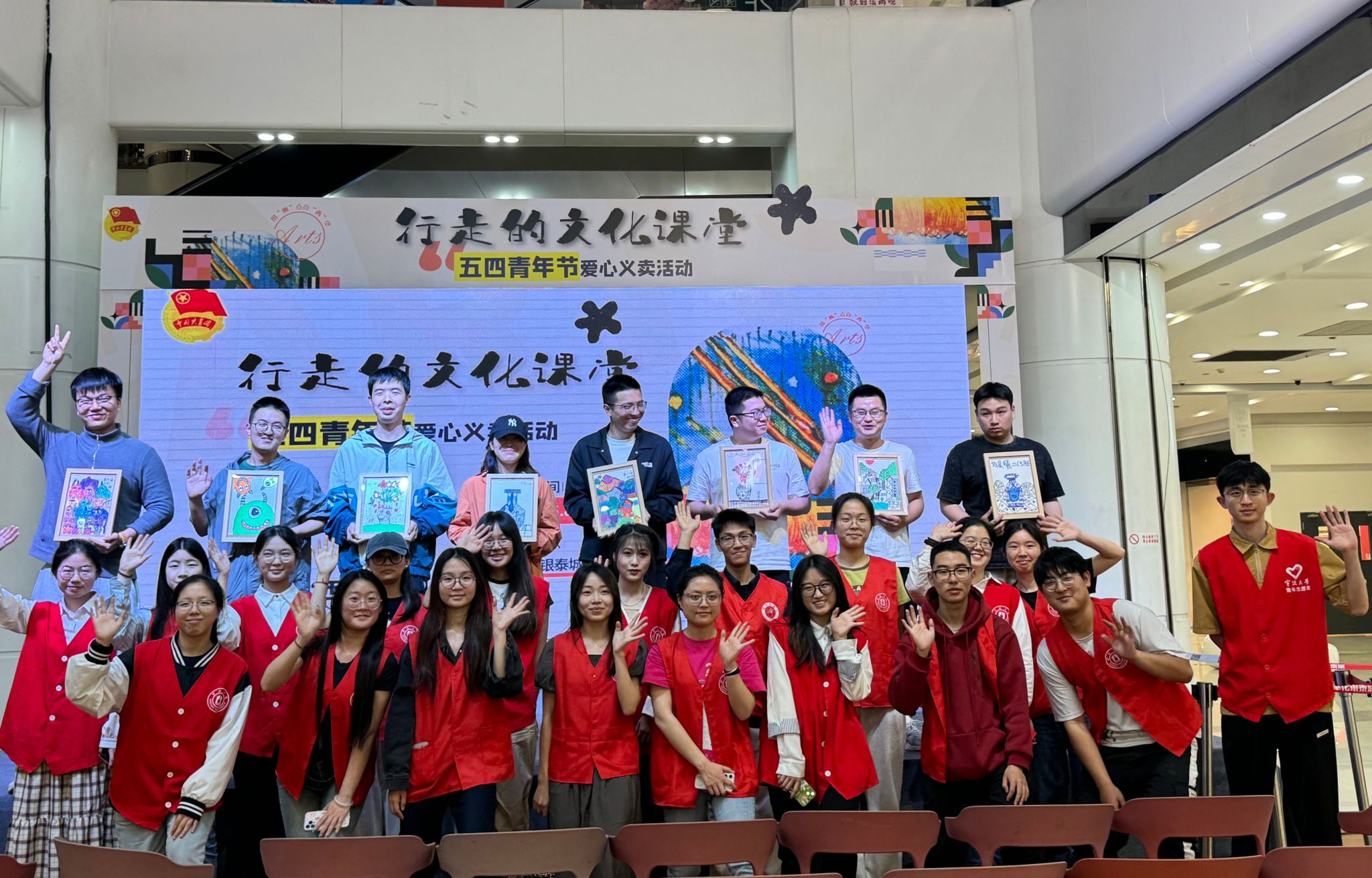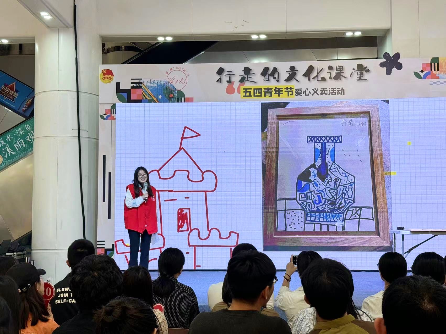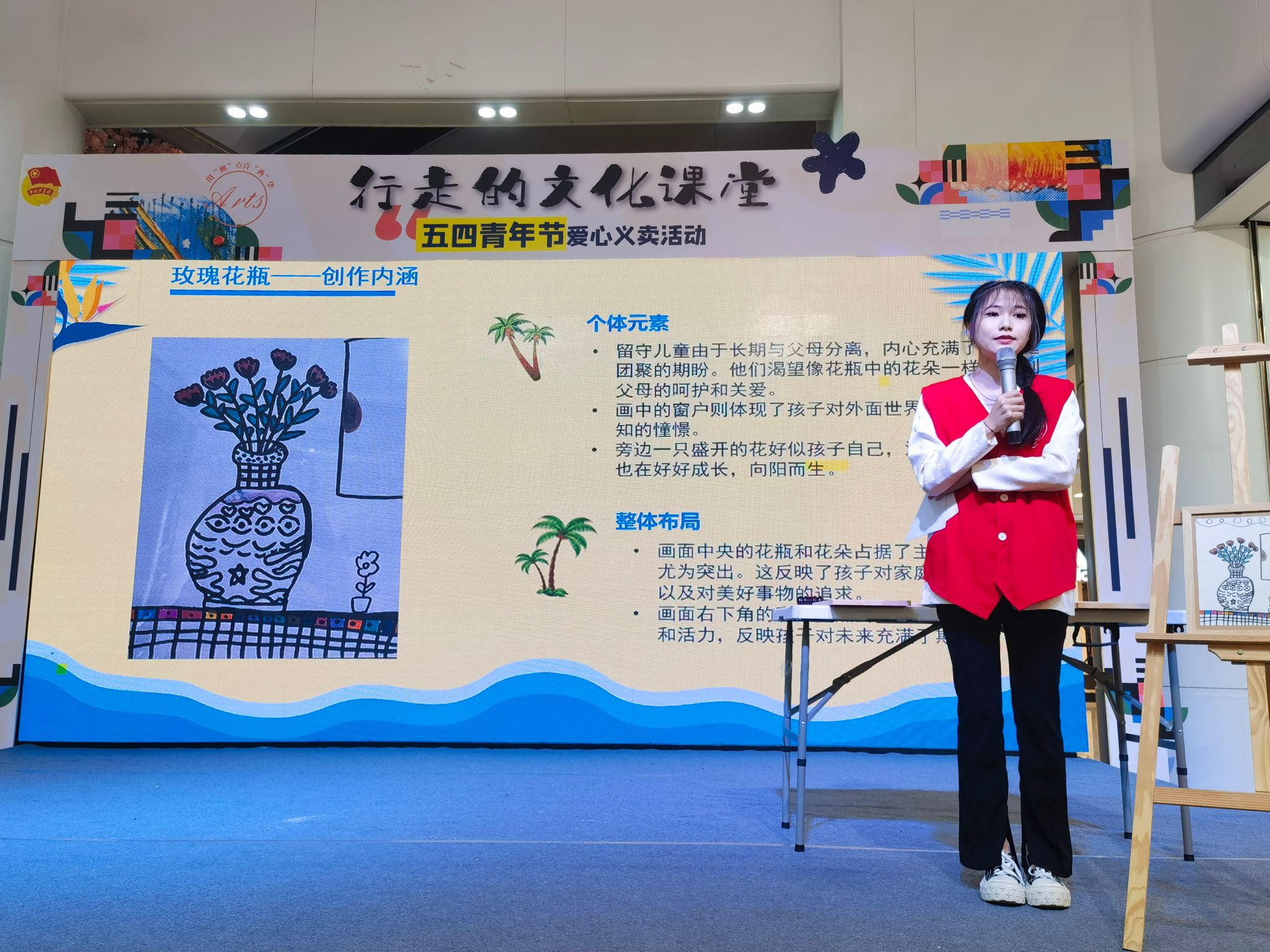 《行走的文化课堂》五四爱心绘画作品义卖活动在宁波市奉化区银泰城火热举行,青年志愿者们穿上特色红马甲热情推销,有的激情演说招揽顾客,吸引众多家长和市民驻足购买。