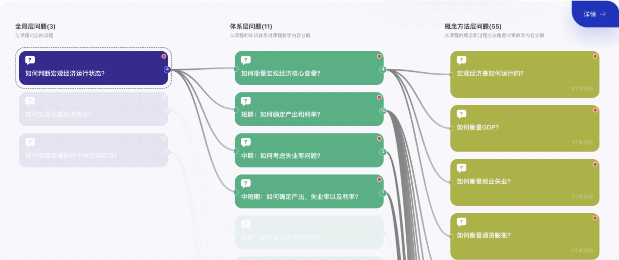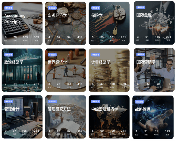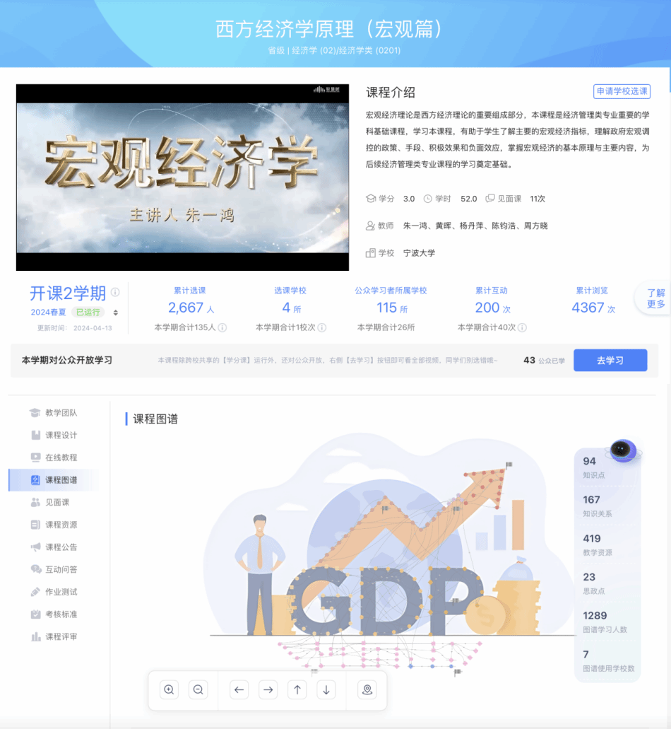 共获批国家级一流课程1门,省级一流课程25门,获批各类省级教学研究项目35项。首批建设的知识图谱AI课程覆盖经济、金融、会计、工商管理、国际贸易5个专业,以能力培养、问题解决为目标,构建教学资源-知识图谱-问题图谱-能力图谱四维综合体系。从经济学经典理论入手,基于权威教材,合理重构知识点颗粒度,共梳理出980个知识点、建构1674个知识关系。在此基础上,建设每门课程的问题图谱,将问题解决与知识学习相关联,通过案例分析、文献研读、模拟操作、PBL教学等方式,赋能线上线下混合式教学,“教学研”融合递进,从而提升学生理实融通能力、创新能力和职业竞争力。