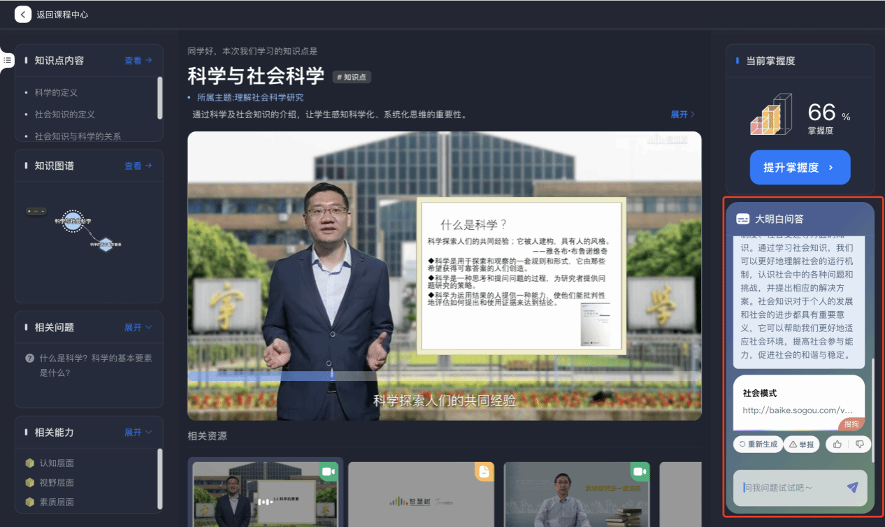 AI人工智能新技术贯穿教学全流程。在教学方面,知识图谱可以融入课前、课中、课后三个阶段,实现对学生学习的过程性、科学化评价,助力教师因材施教,提高教学质量。智能教学助手“AI大明白”搜索优质教学资源相匹配,实现知识的持续更新和迭代。