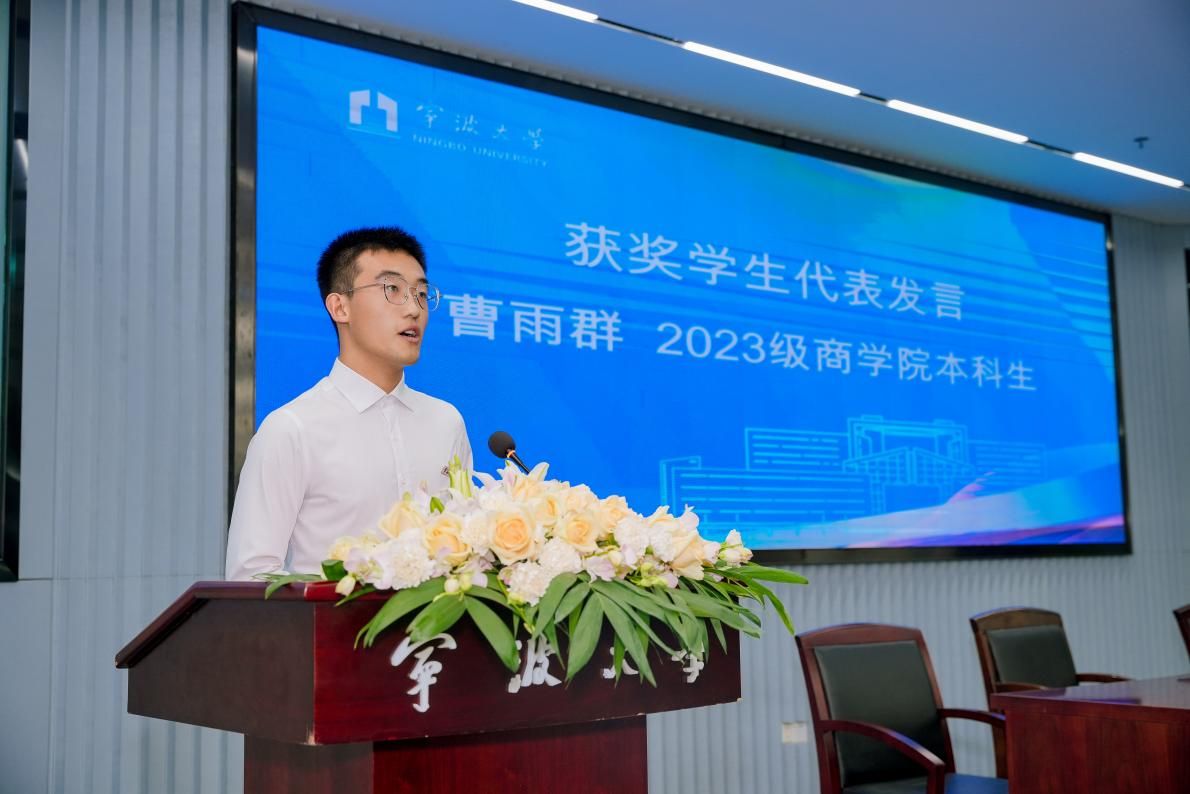 2023级信息管理与信息系统专业本科生曹雨群发言。他讲述了自己家庭和求学的故事,表示陆董的善举减轻了他的经济负担,激励他追求学业和个人成长。他表示,未来将继续努力,力争在学习和实践中取得更大成绩,并以实际行动回馈捐赠者,回馈社会。