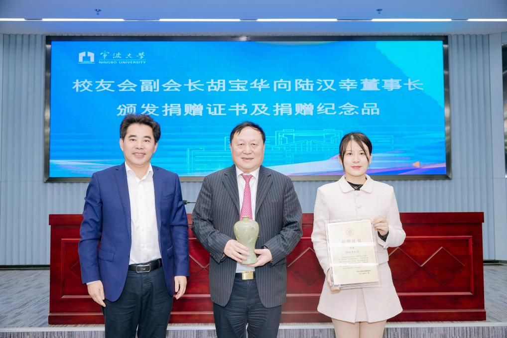 校友会副会长兼秘书长胡宝华先生代表学校向陆汉幸先生颁发捐赠证书并赠送纪念品。