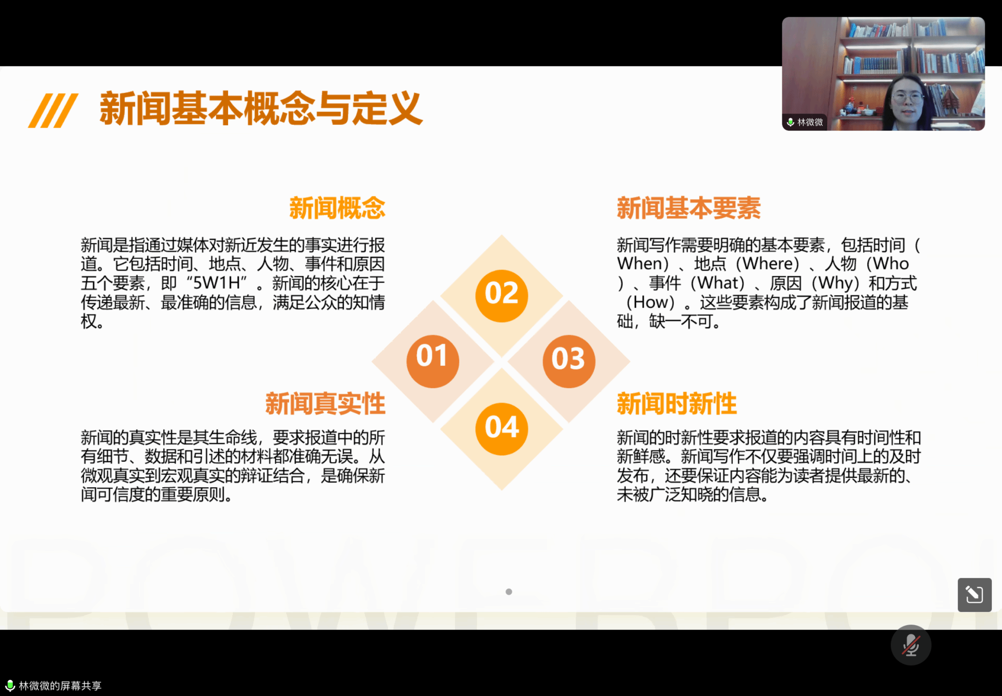 课程伊始,林微微详细介绍了新闻的基本概念与定义。她从四个部分进行了深入浅出的讲解,着重强调了“5W1H”是新闻报道的核心要素和基础,明确了真实性是新闻的生命线,使学生干部建立了对新闻的基本认识。