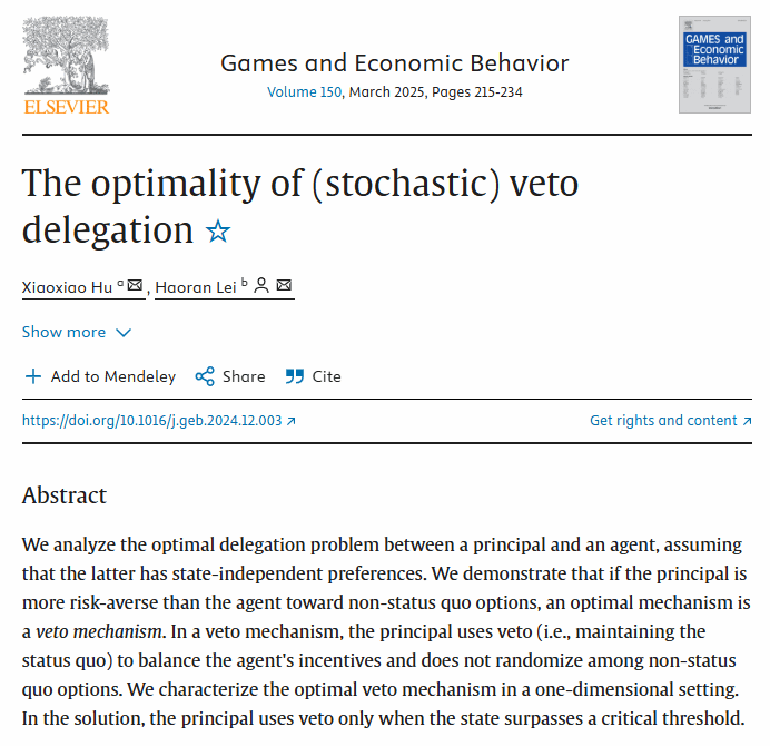 经济系青年教师胡枭骁与湖南大学青年教师雷浩然合作的研究论文“The Optimality of (Stochastic) Veto Delegation”在博弈论领域国际顶级经济学期刊《Games and Economic Behavior》上发表。该期刊专注于博弈论及其应用的前沿研究,内容涵盖社会科学、行为科学、数学科学和生物科学等多个方向。作为该领域的顶级期刊,其年刊出的原创性论文仅百余篇。本文是十大菠菜网站