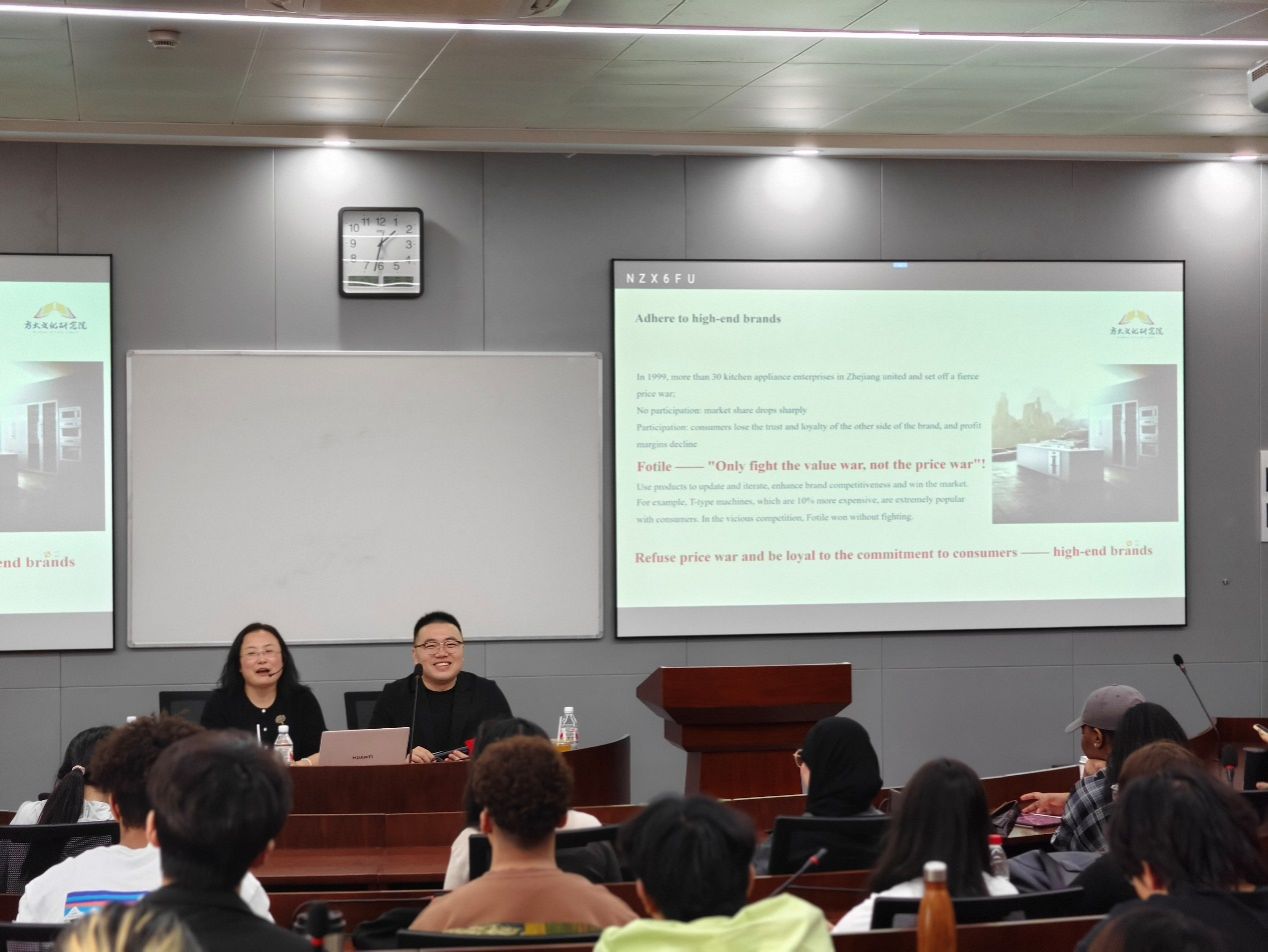 学习的点点滴滴,感恩母校培养和院系老师的栽培鼓励,作为学长给予在座同学们诸多建议和鼓励。接着,刘达以方太集团发展历程为主线,回溯企业从“飞翔集团”二次创业至今的蜕变。他重点阐释了方太坚守高端定位、拒绝价格战与短期利益的战略选择,方太通过“美善创新”“以心为本”等核心理念,打造出兼具科技实力与文化底蕴的品牌。数据显示,方太坚持每年投入超5%营收用于研发,累计专利达1.2万项,2017年营收突破百亿,2022年逆势增长至162亿。此外,刘达分享了方太以中华优秀文化为核心的管理实践,如全员身股制、NPS服务系统、“五个一”修身计划,强调“文化自信是中国企业立足全球的根基”。讲座现场,中外学子就跨文化管理、企业社会责任等话题展开互动交流,同学们在了解到方太一以贯之的高端品牌建设思路、结合中西文化的管理思想后收益颇多,并提出了诸多颇有见地的问题。