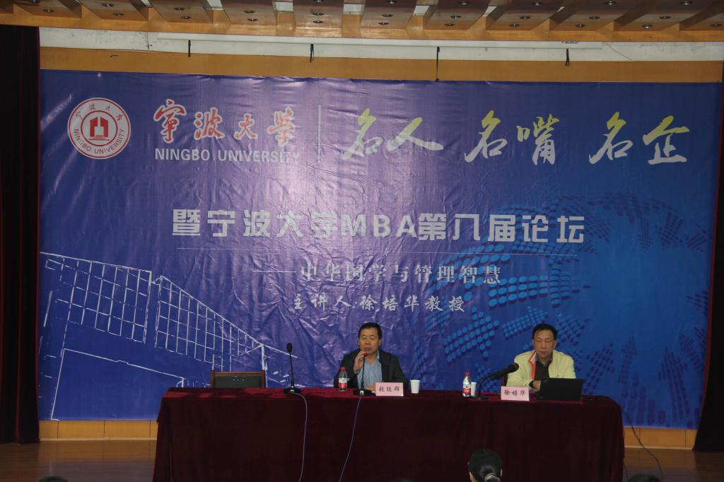本次论坛邀请了复旦大学经济学教授、华商研究中心主任、中国商业史学会副会长徐培华先生作为论坛的主讲嘉宾。本期主题是《国学智慧与现代管理》,他从国学智慧与传统文化、国学精华与管理之道、中西文化与现代管理 之道三个方面阐述了国学的博大繁富,徐老师广博的知识和深厚的学术底蕴赢得了广大MBA学员的高度认可,尤其提出的“儒商、佛商和新华商”理念引起学员广泛关注和重视。学员们被他幽默、风趣的授课方式所折服,纷纷表示受益匪浅。本次论坛的成功举办,对于活跃MBA学员的学术氛围,拓展MBA学员的知识视野,扩大宁波大学MBA的社会影响力,探索MBA教育模式,增进学员间交流和友谊具有重要意义。