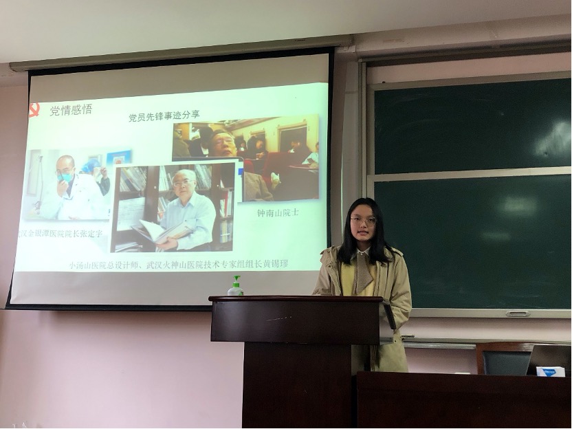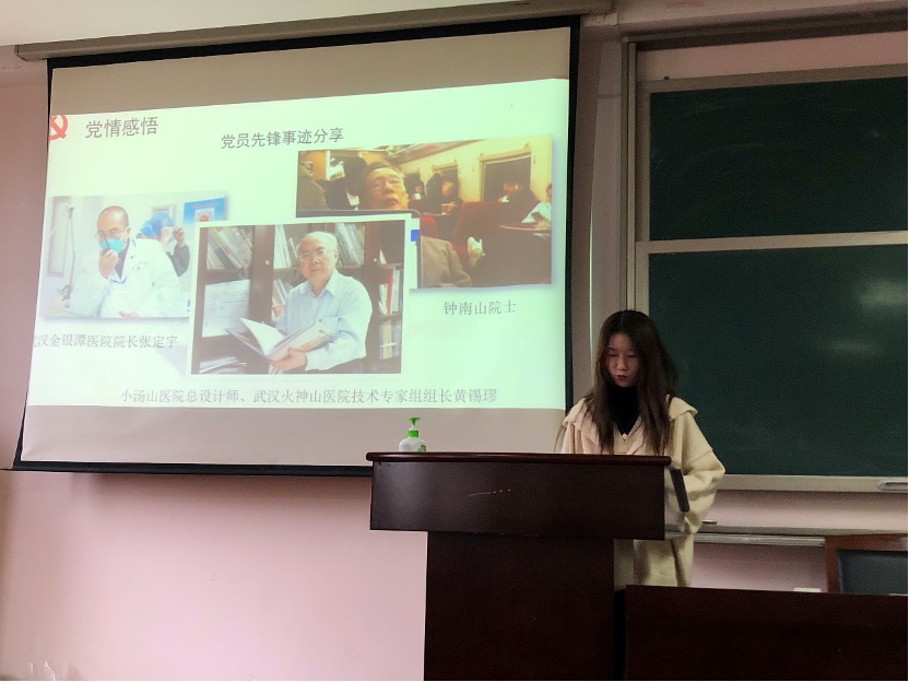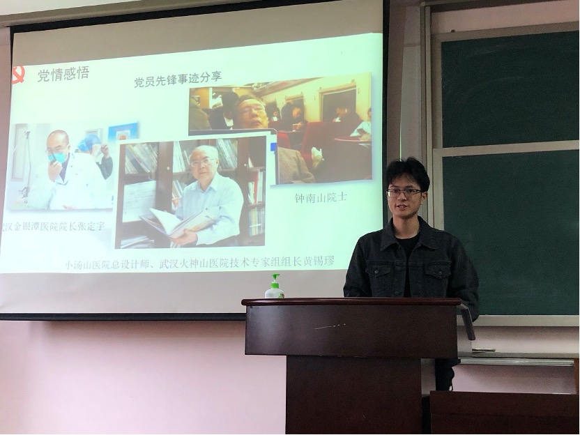 最后进入党情体悟环节。第七党支部的金越、金鸿飞和第八党支部的金昱琳,分别分享了武汉金银潭医院院长张定宇、武汉火神山医院技术专家组组长黄锡璆和终南山院士的抗疫事迹。