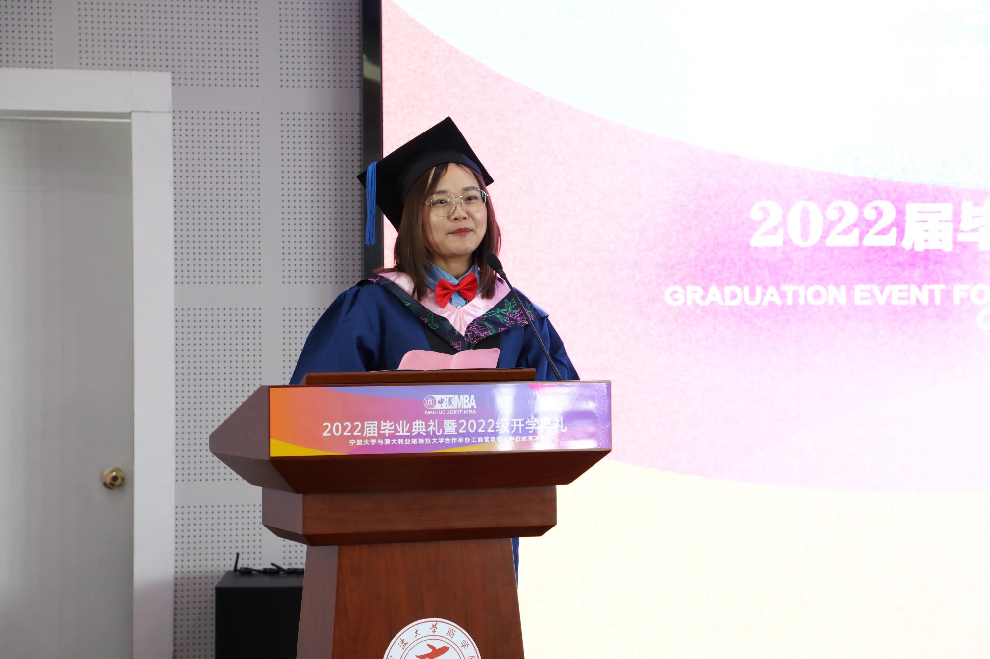 在澳大利亚堪培拉大学的毕业典礼现场视频播放后,金院长首先致辞。他祝贺同学们顺利完成学业,感谢老师们的辛勤付出,也感谢社会各界对宁波大学中澳MBA发展的支持。他指出中澳MBA项目应该及时顺应社会发展变化趋势,定位高质量发展培养体系,培养更多“有创新思维,懂资本运营”的人才;同时,他还提出“大学MBA”教育应通过学生自主“批判式”学习,敢于挑战教科书中的权威理论观点,增加同任课教师的课堂互动,“敢问问题”、“会问问题”,来有效提升课堂的教学质量,增加学习的探索性和研究性;第三点,他提出项目要进一步提高游学活动质量。“读万卷书,行万里路”。培养学者和有思想的人,“行万里路”是非常重要的。金院长通过分享他暑期的游学经历,倡导MBA学员们要不断丰富自身的思想体系,训练悟性,激发灵感,为明天步向成功做好准备。