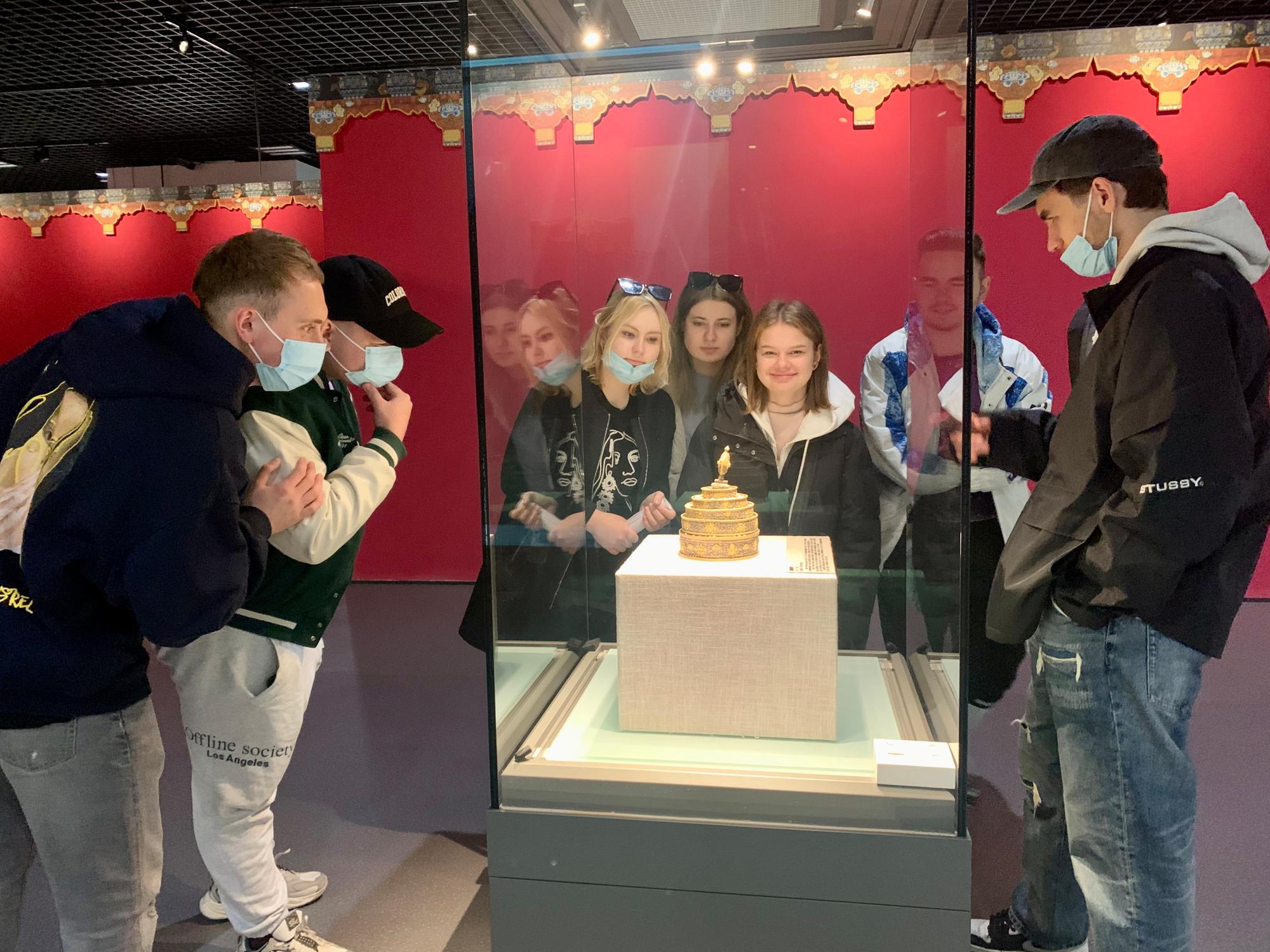 一楼两个展厅正分别在进行以中国古代饮食文化为主题的“食礼中华”展览,以及晚清著名国画家、书法家、篆刻家,首任“西泠印社社长”吴昌硕先生书画展。学生们通过展馆墙上的英文介绍,以及师生现场交流互动,理解吸收展览内容。随后,在二楼的宁波历史文化陈列馆中,学生们认真而详细地了解了宁波“河姆渡文化”的历史起源,以及宁波由秦汉至隋唐,乃至宋明之后的历史、文化、农业与商贸发展。在游览过程中,学生还偶遇了一群上海同济大学的留学生,双方进行了短暂交流。在三楼,众人参观了西藏历史文物珍品展。