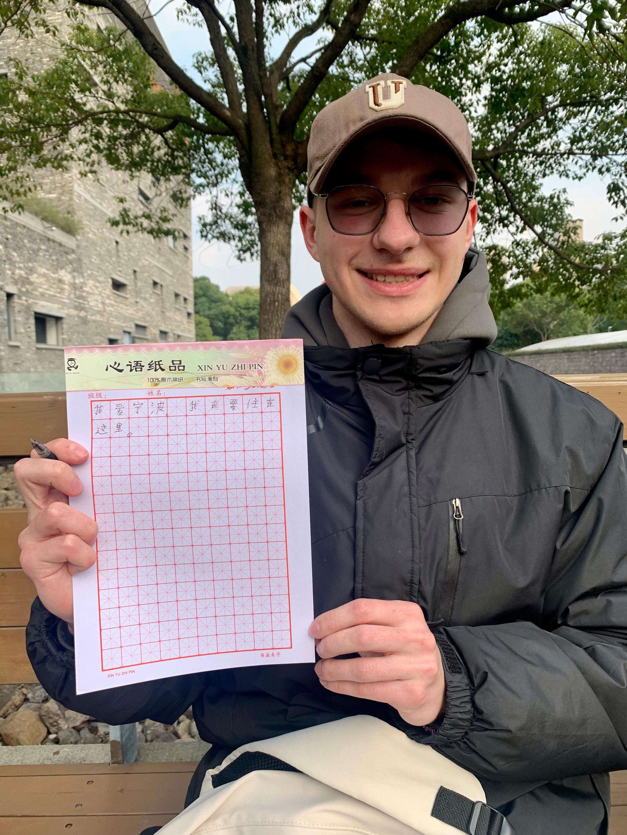 为鼓励留学生的汉语学习,每个人还分到了一本“田字簿”。学生们一拿到手就迫不及待地写下了自己的感受:我爱宁波,我真要住在这里。