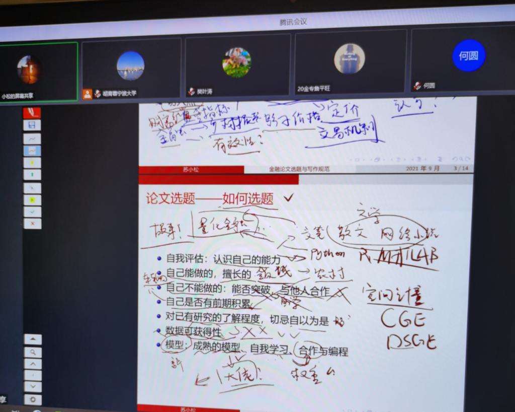 9月8日晚上,十大菠菜网站 金融硕士教育中心邀请苏小松博士作《金融论文选题与写作规范》线上讲座。金融系教师、金融专硕研究生、金融学硕研究生参加。金融硕士教育中心执行主任胡育蓉主持。