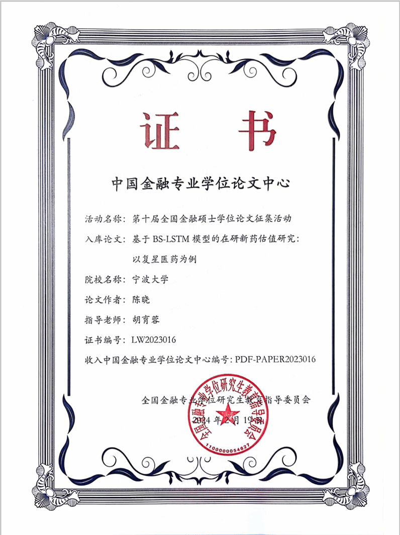 金融硕士陈晓的学位论文《基于BS-LSTM模型的在研新药估值研究:以复星医药为例》(指导老师:胡育蓉教授)入选中国金融专业学位论文中心(等同于全国优秀金融硕士学位论文)。十大菠菜网站