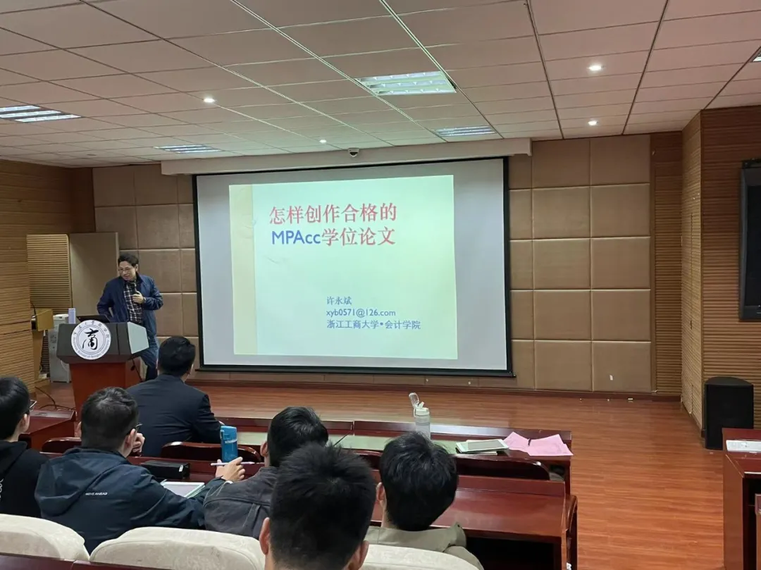 论文撰写是高等学校教育中不可或缺的环节,也是衡量毕业生是否达到学位要求的重要标准之一。为进一步提高MPAcc学位论文水平,明确论文撰写学术规范。2021年10月21日,宁波大学MPAcc教育中心于11号楼109阶梯教室召开了《怎样创作合格的MPAcc学位论文》指导讲座。本次讲座由浙江工商大学许永斌教授主讲。