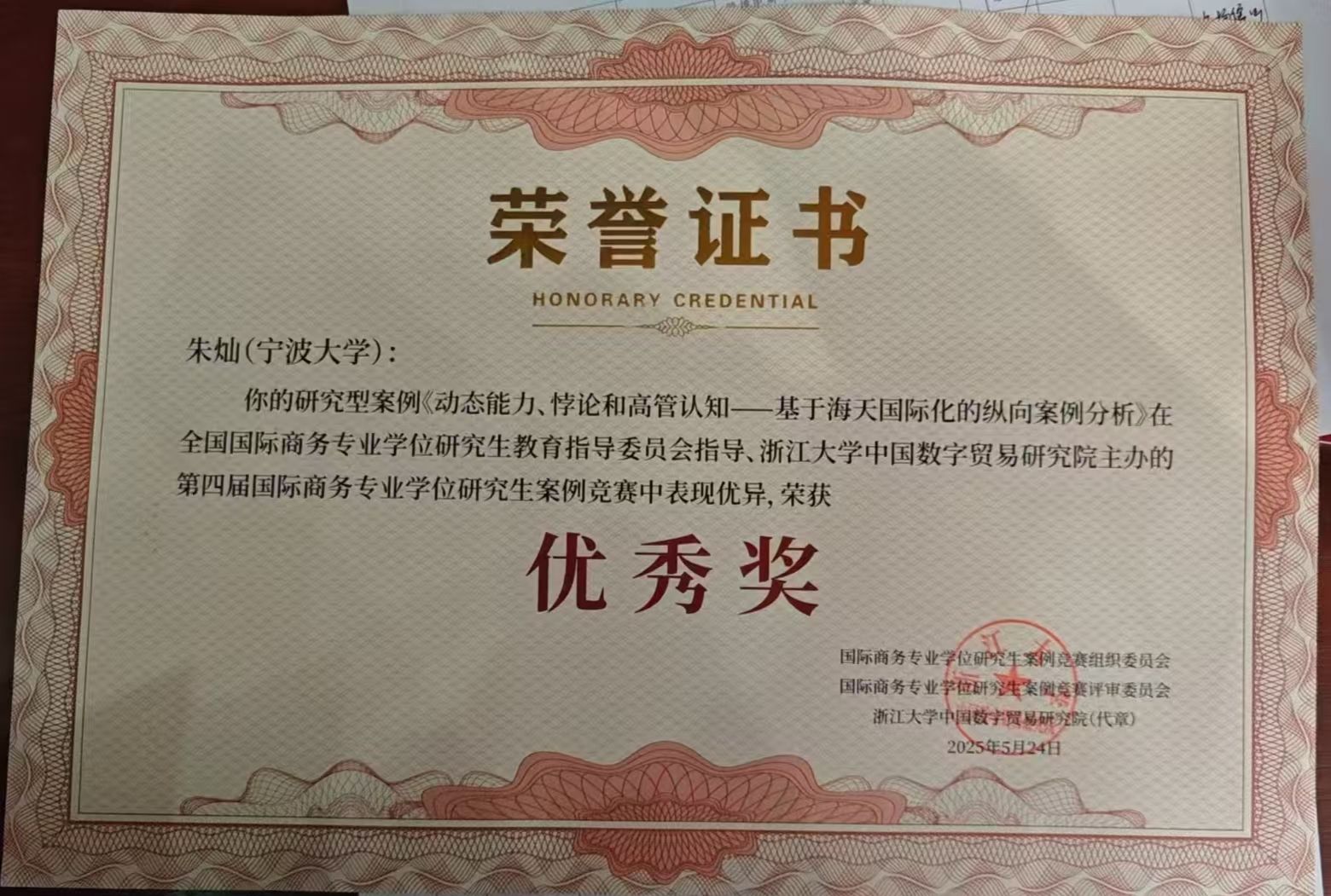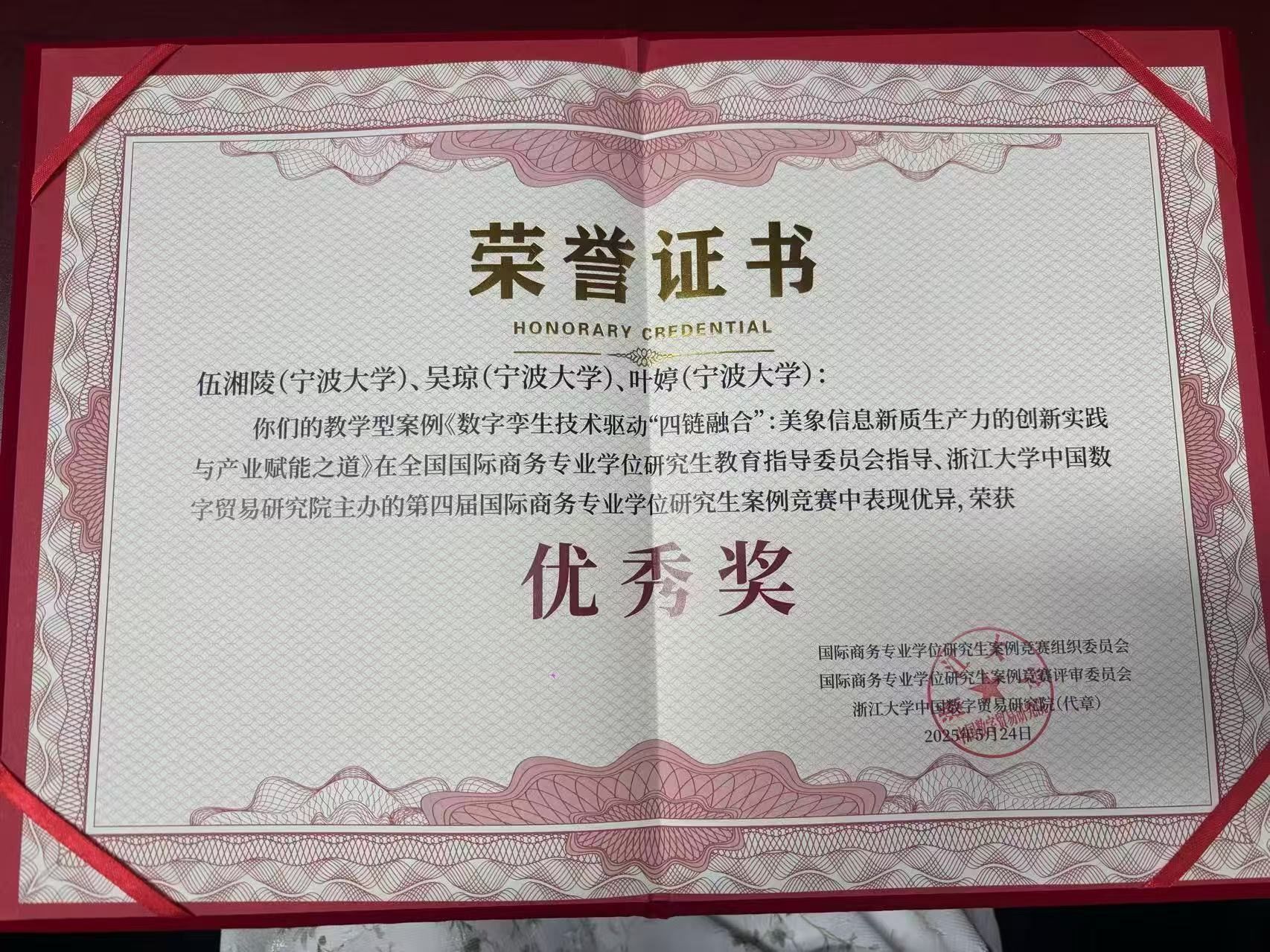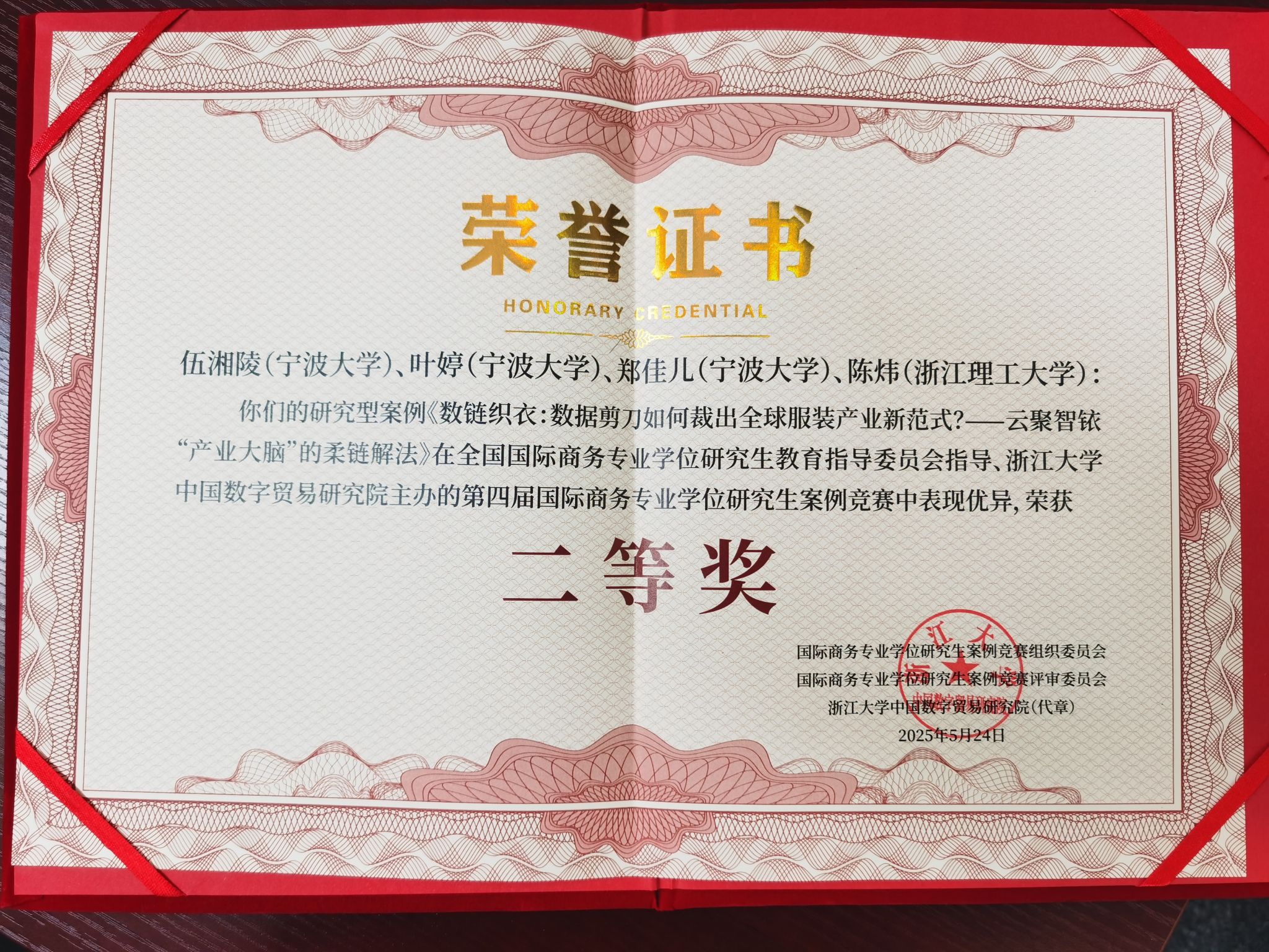 本次竞赛于2024年12月启动,经严格评审,产生教学型案例、研究型案例一等奖各3篇、二等奖各5篇、三等奖各10篇、优秀奖各10篇。在此次案例评选活动中,我校MIB专职导师伍湘陵与2024级MIB研究生叶婷、郑佳儿撰写的案例《数链织衣:数据剪刀如何裁出全球服装产业新范式?——云聚智铱“产业大脑”的柔链解法》获评研究型案例二等奖,伍湘陵老师与2024级MIB研究生吴琼、叶婷撰写的案例《数字孪生技术驱动“四链融合”:美象信息新质生产力的创新实践与产业赋能之道》获评教学型案例优秀奖,2023级MIB研究生朱灿撰写的案例《动态能力、悖论和高管认知——基于海天国际化的纵向案例分析》获评研究型案例优秀奖。