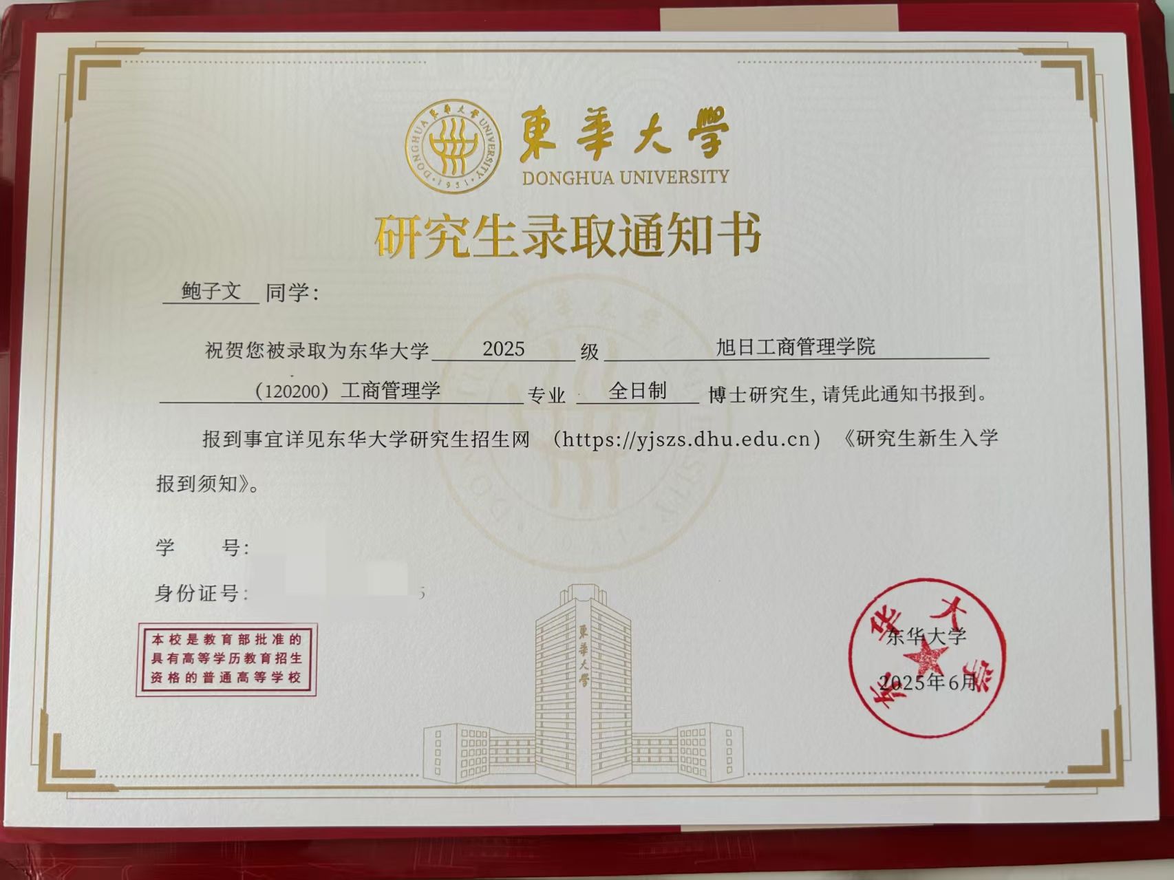近期,我校2022级MIB毕业生陆续传来升学捷报,张朝阳、方嘉彬、诸鑫哲、鲍子文、职梦露等5名同学分别被多所高校录取为博士研究生,展现了MIB学子扎实的学术素养与不懈的进取精神。