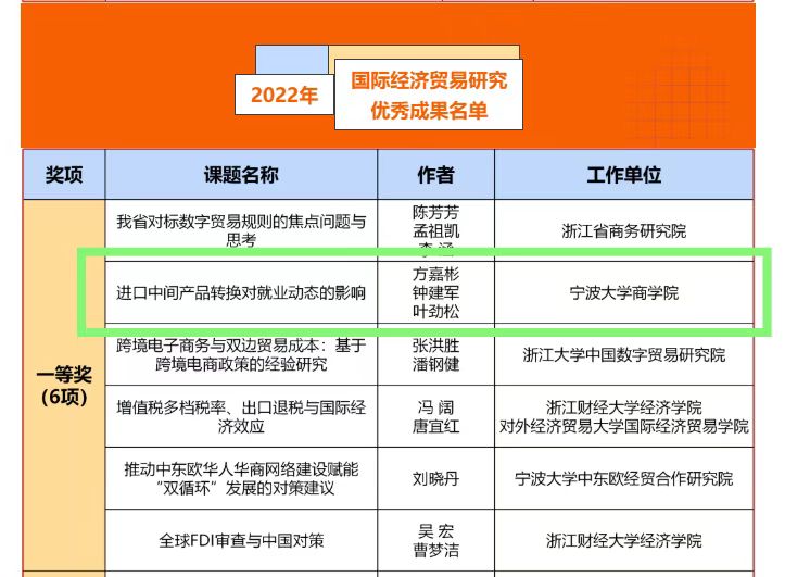 日前,浙江省商务研究院发布了“2022年浙江省国际经济贸易研究优秀成果”评选结果,我校国际商务专硕学生方嘉彬撰写的论文“进口中间产品转换对就业动态的影响”获评一等奖。