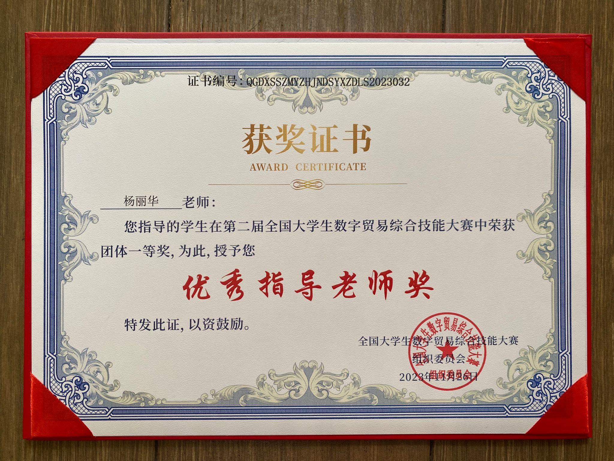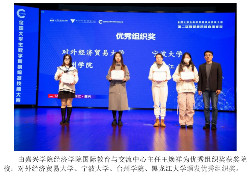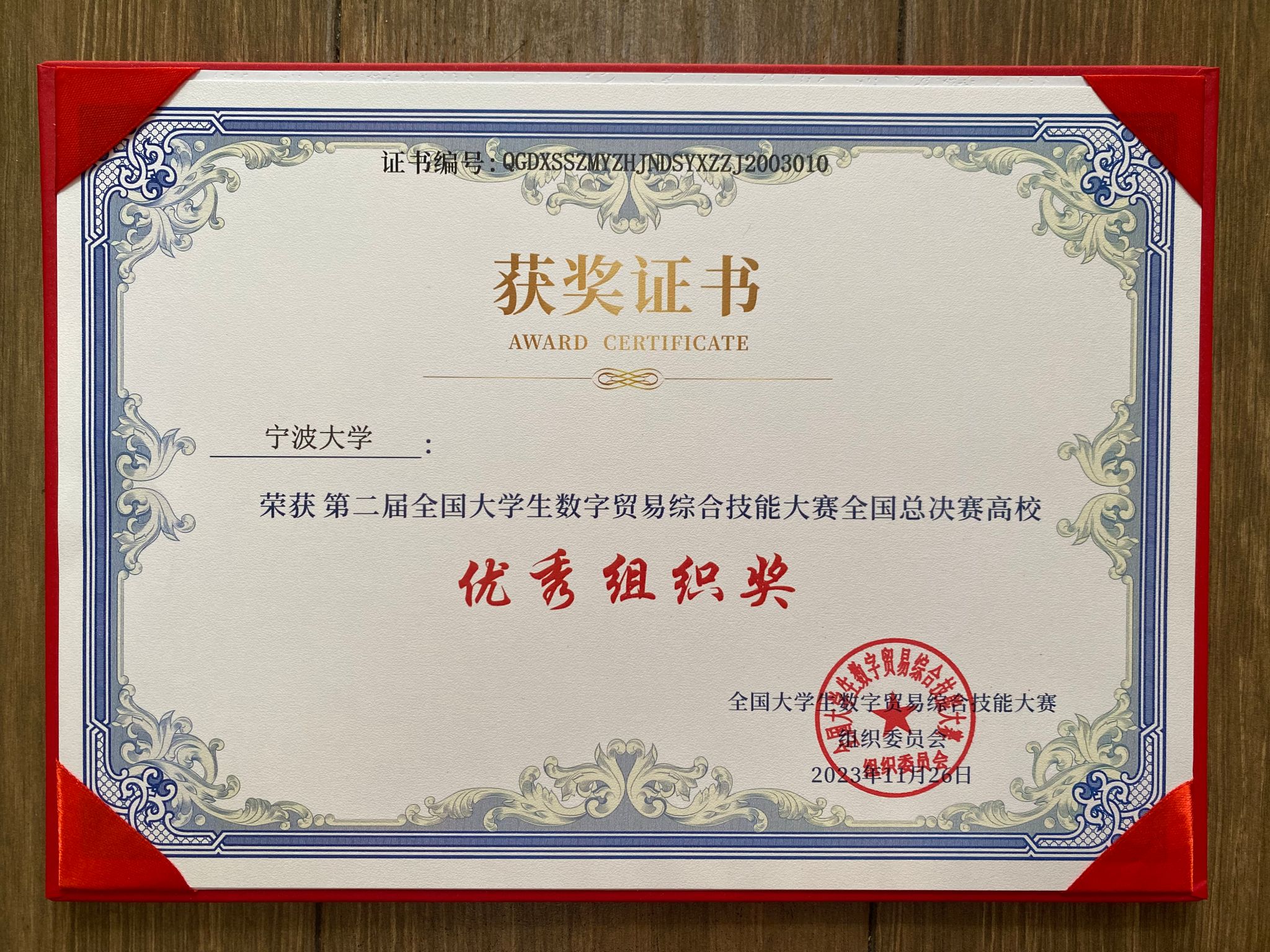 经过激烈的角逐,1597队在本次比赛中荣获全国一等奖,其余三支队伍也取得了全国二等奖的好成绩,我校杨丽华老师荣获优秀指导老师奖,宁波大学也被授予优秀组织奖。我校旨在培养具备全面的国际商务视野和国际化经营管理能力的人才,使其能够灵活应对全球商务环境和市场的变化。此次全国大学生数字贸易综合技能大赛促使MIB学子在实践中把握市场,与真实的客户面对面交谈,全英文的直播方式提升了其跨文化交流的能力,这对于今后的跨国商务合作和职业盛业发展都将带来重要帮助。