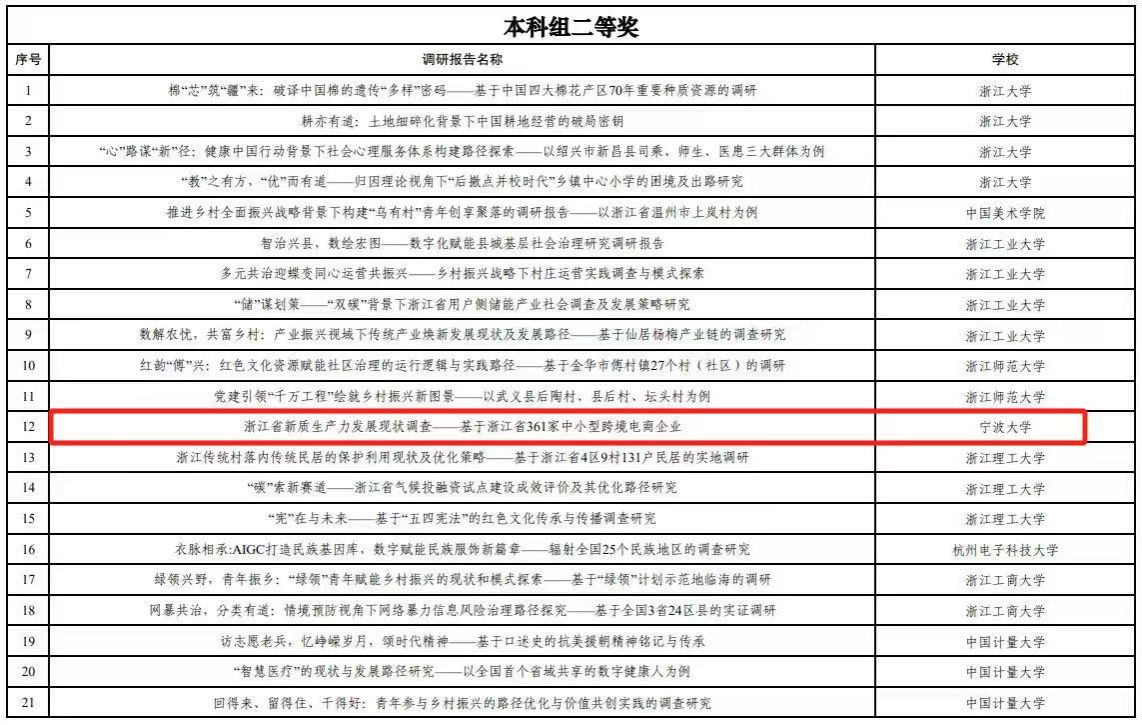 由我校MIB研究生为主组建团队的“浙江省新质生产力发展现状调查--基于浙江省361家中小型跨境电商企业”实践调研项目荣获二等奖。