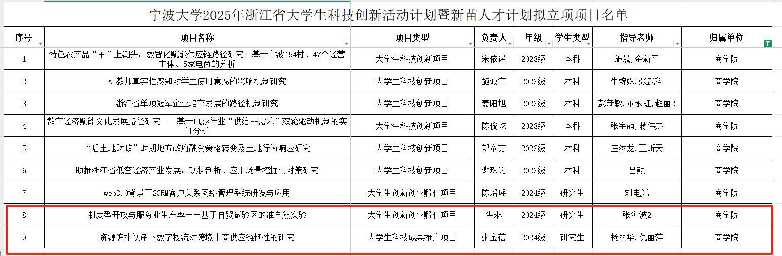 3月7日,2025年浙江省大学生科技创新活动计划暨新苗人才计划立项结果正式公布。24级国际商务专业研究生张金蓓、湛琳同学作为项目负责人,其项目在大学生科技创新项目中成功立项,展现了十大菠菜网站