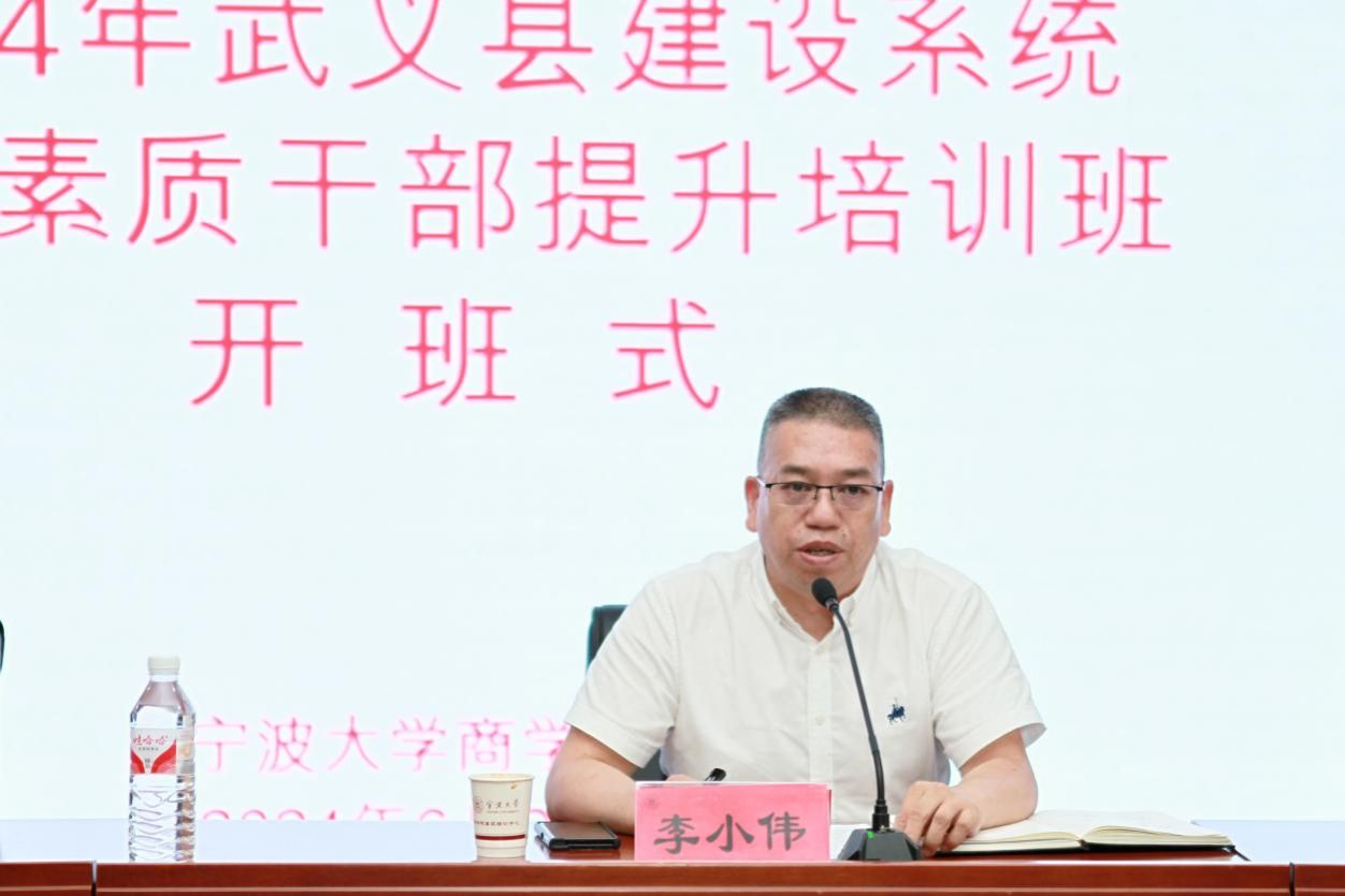 李小伟作了开班动员讲话。他首先对宁波大学的领导和老师们对此次培训的大力支持和精心安排表示衷心感谢。希望大家走进双一流学府好好感受学习氛围,为更好地做好此次培训工作,李局长提出以下几点要求:一要通过学习立标杆,在工作标准上不断提高;二要通过学习谋良策,在细枝末节上不断提升;三要通过学习求实效,在应变求变中奋力赶超。他希望大家抓住此次学习培训机会,打开视野、拓展思维、丰富知识,把学习成果带回到工作岗位,进一步激发锐意创新的勇气、敢为人先的锐气、蓬勃向上的朝气,争当武义跨越发展的“推动者”“拉弓人”,为打造都市范山水韵现代化活力新武义贡献建设力量。