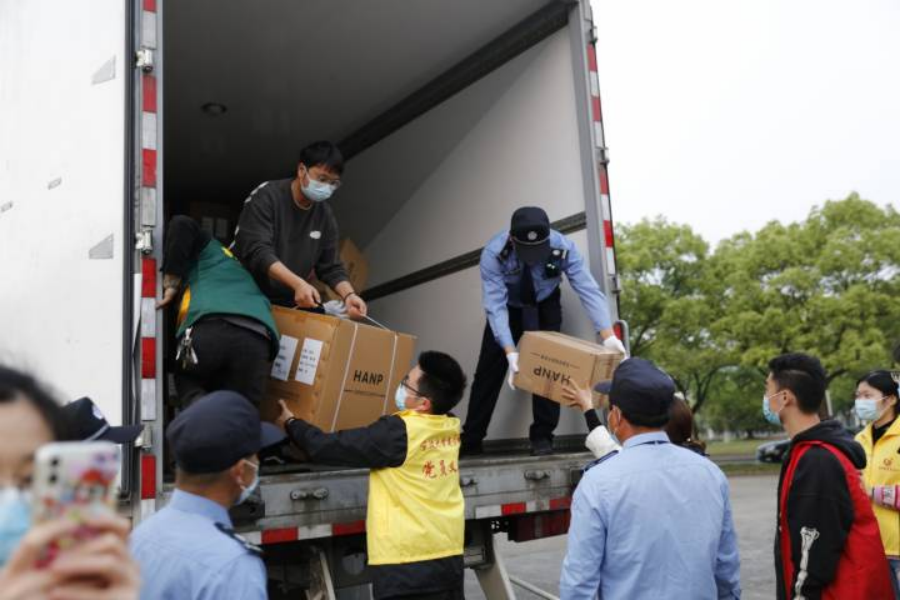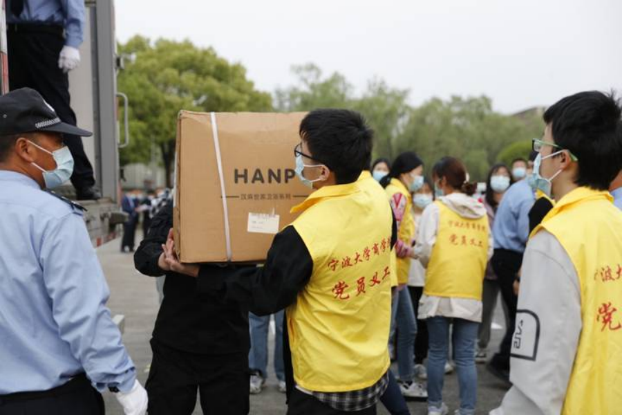 “被暖到了”“谢谢”……在物资接收现场,宁大师生纷纷点赞雅戈尔集团的善举。